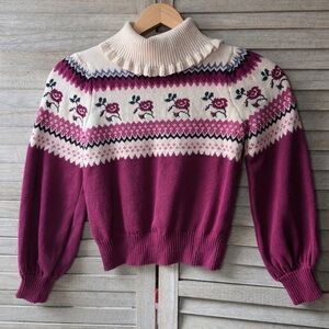 Beautifully crafted knit sweater featuring a rich burgundy base with cream Fair Isle–style floral detailing across the chest and sleeves. Finished with a cozy ruffled turtleneck and ribbed cuffs and hem for a classic, polished look.