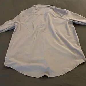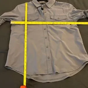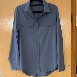 Stylish gray button down shirt. Departure 2.0 shirt. Rolled tab sleeve button areas have been removed. Not at all noticeable and no damage to the shirt. Features two chest pockets. Ideal for casual wear. Quick dry. Awesome for travel and adventuring.