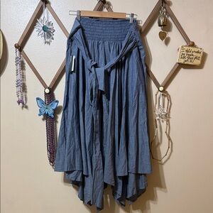 Chic asymmetrical skirt with a flowing design. Adds elegance to any look. Light weight and flowy! Tie can be in front or back. Measurements are waist 18 in and length at longest point is 40 in