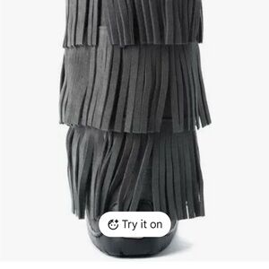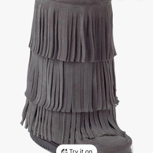 Step out in style with these chic gray fringe moccasins. Perfect for adding a touch of flair to any outfit.