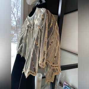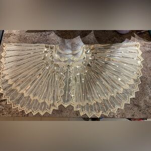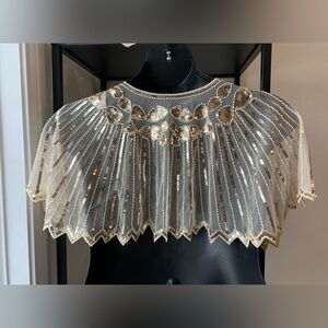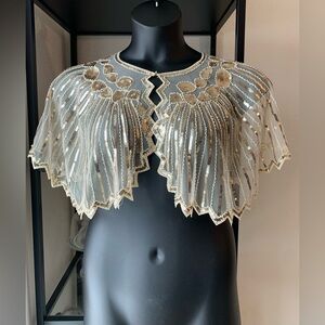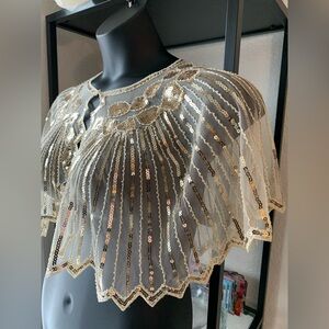 Stunning sheer capelet adorned with gold and silver sequins. 1920’s Art Deco Great Gatsby vibe. Perfect for adding a touch of glamour to any outfit. Like new condition, worn once. One size, see measurements in photos.