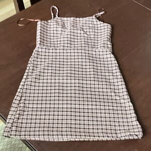 Charming plaid dress by GB girls. Features a classic brown and pink pattern. Perfect for casual outings. Adjustable straps.