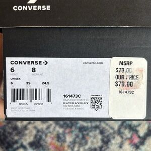 Step out in style with the classic Converse All Star high-top sneakers. These black shoes offer timeless appeal and unmatched comfort, perfect for any casual outing. Excellent used condition. Only wore a handful of times for indoor weightlifting and once to a concert. Unisex size 8 women’s or 6 men’s as shown on box, which is included.