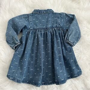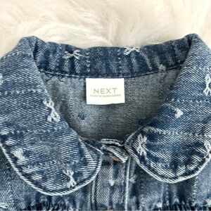Adorable NEXT baby denim dress featuring a delicate allover bow print and a classic Peter Pan collar. Soft denim feel with long puff sleeves, elastic cuffs, and a gathered waist for a comfy, roomy fit. Button-front detail adds extra charm—perfect for fall outfits, photos, or special occasions.