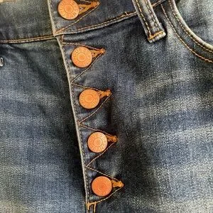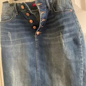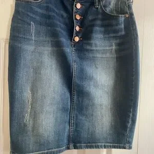 Chic denim skirt with button details. Classic blue hue. Length is 21” , waist is 15”