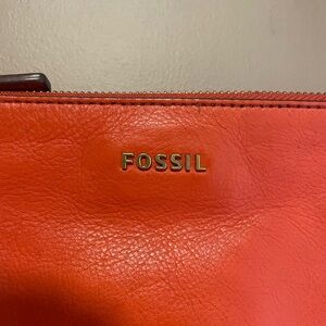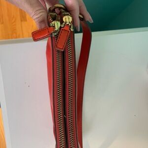Leather, two zipper compartments, spots for cards, zipper interior pocket, removable strap