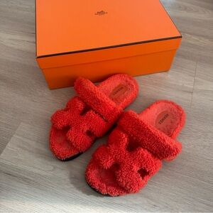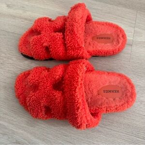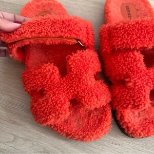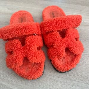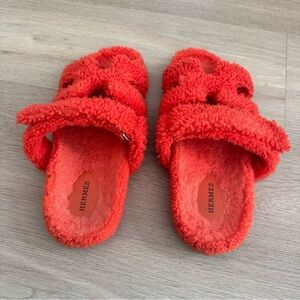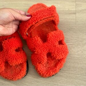 Hermes Orange Shearling Chypre Sandals Sz 40.5