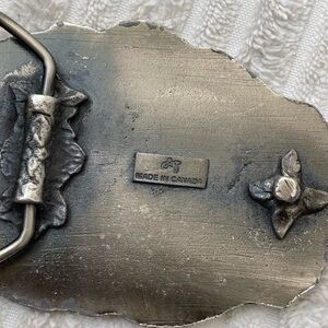 👉Vintage Made in Canada western leather belt with a corrosion resistant “Em-Te Town” brass buckle depicting a western scene with a fence & saddle. Size 47”