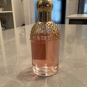 Elegant Guerlain fragrance featuring a gold cap and pink liquid. Luxurious design with intricate details.