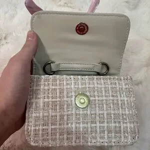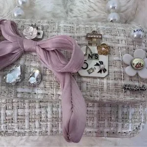 Tweed fancy purse with charms, a pearl top handle, and a satin bow trim. Brand new original price $60 girlie Paris handmade bag.