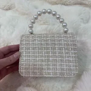 Tweed fancy purse with charms, a pearl top handle, a cross-body golden chain, and a satin bow trim.