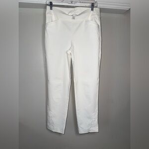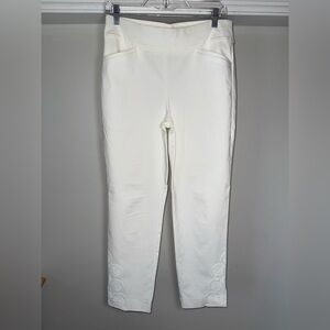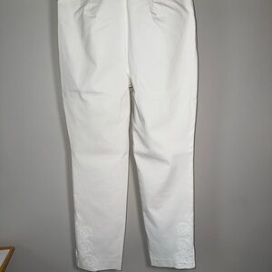 Polished and versatile Chico’s ankle pants in crisp white with a beautiful embroidered ankle detail. A flattering, easy-to-style piece for work or everyday wear.