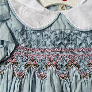 Charming light blue dress with intricate smocking. Features a crisp white collar and delicate pink floral embroidery.