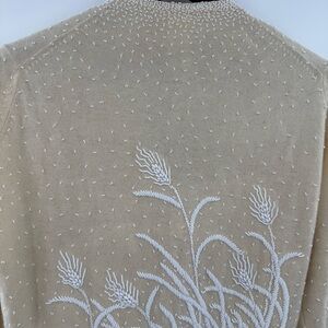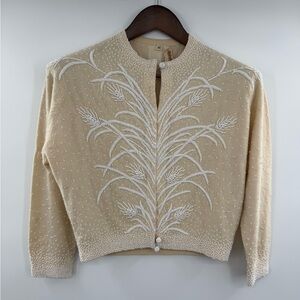 Exceptional true vintage cardigan featuring dense hand-applied glass bead embroidery in a wheat sheaf motif on front and back. Crafted from a luxurious angora and lambswool blend, fully beaded throughout with heavier beadwork at cuffs, hem, and neckline. Traditional hook-and-eye front closure with original interior lining intact. This is the kind of craftsmanship you simply do not see anymore — labor-intensive, ornate, and made to last. A collector-level sweater that wears beautifully as a cropped statement layer.