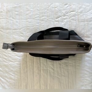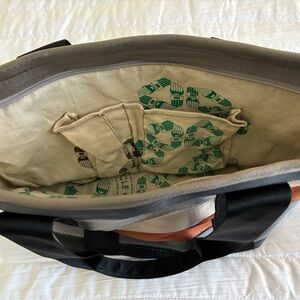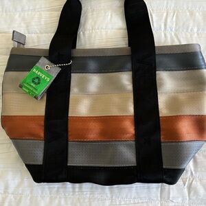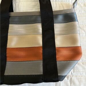 Stylish tote bag by Harveys. Features black, gray, and orange stripes. Durable and spacious design.