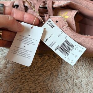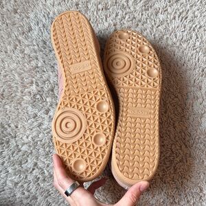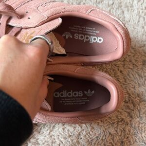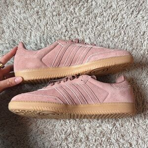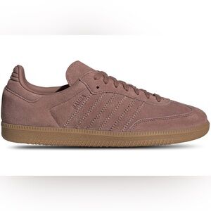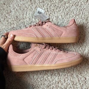 New with tags never worn Adidas Samba OG Shoes size 10.5 women’s, 10 male. Retail $106 color warm clay (like a mauve pink!) with gold adidas logo on shoe tongue. Dress these up or down! They are SO comfy, a closet staple! Just too big for me!