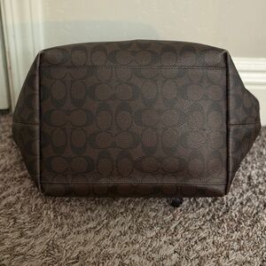 Beautiful Coach signature tote in classic brown monogram print. This bag features durable coated canvas with leather trim and shoulder straps, plus gold-tone Coach logo hardware on the front.
