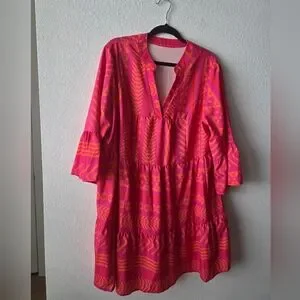 Vibrant pink and orange dress. Features geometric patterns. Flowy design with tiered layers. Perfect for casual outings.