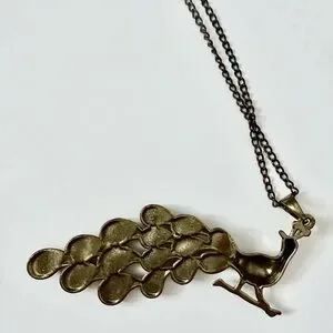 Bold oversized peacock pendant necklace featuring a vibrant green stone and antique brass tone finish. Long statement length with boho, vintage-inspired flair—perfect for layering or elevating a simple outfit.