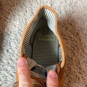 Good used condition BANGS High Top Shoes size men’s 7.5/ woman’s 9. Some slight scuffs on bottoms but no holes or tears or stains! So much life left!! I just don’t reach for them anymore. Laces in perfect condition. Would be so cute embroidered on the side!!