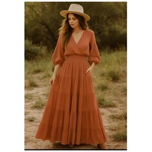 Step out in style with this elegant terracotta midi dress. Featuring graceful balloon sleeves, it's a versatile choice for any event.