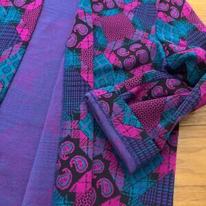 vintage, sweater jacket, open front, paisley, diamond, check, teal, sweater blazer, 70s, 80s, funky, groovy