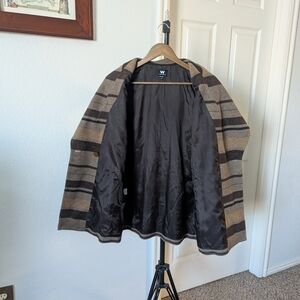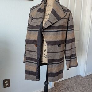 Like new condition. Stylish Shaw collar coat with bold stripes. Features a single button closure. Ideal for layering.