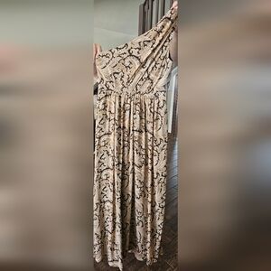 One shoulder intricate paisley design! So beautiful! Love the faux leather buckle detailing! Gorgeous Neutrals! Such a beautiful maxi dress!