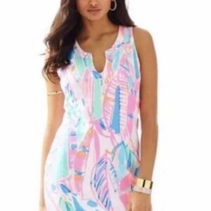 Chic and vibrant swim coverup. Features a lively mix of pink and blue. Perfect for sunny beach days.