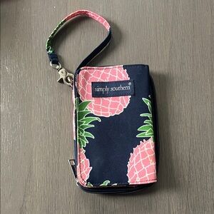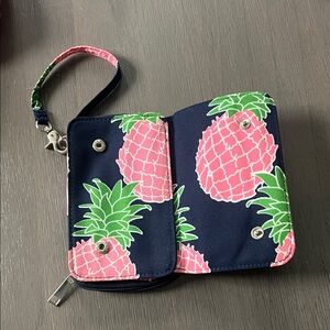 Chic navy and pink wristlet with vibrant pink floral pineapples. Includes lots of storage and a handy strap and for easy carrying.
