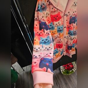 Vibrant hooded long cardigan with a playful knitted cat print. Features a mix of pink, blue, orange & white colors ๐ป๐ฉท๐๐งก๐ค