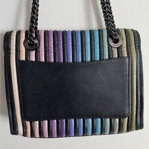 Coach shoulder bag with vibrant stripes. Features a chain strap and turn-lock closure. Perfect for any occasion. Has wear. Please see pictures.