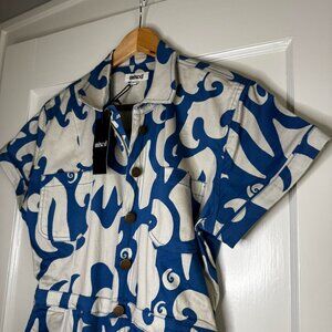 Step out in style with this chic blue and white patterned jumpsuit. Perfect for any occasion, this piece offers both comfort and elegance.