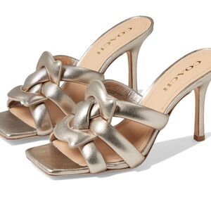 Step out in style with these elegant gold heeled sandals from Coach. Perfect for any occasion, these shoes offer both comfort and sophistication.
