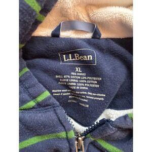 LL Bean full zip hoodie. This comfortable hoodie features a classic navy blue and green stripe pattern and a soft, cozy fleece lining for extra warmth. Perfect for casual outings, outdoor adventures, or relaxing at home.