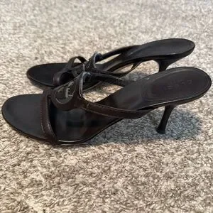 Chic black sandals featuring iconic Gucci logo. Sleek design for versatile wear.
