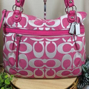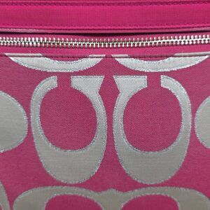 A bold, playful classic from Coach’s Poppy line — this Metallic Signature Sateen Glam Tote (style 18979) features a vibrant pink base with creamy white Signature C’s outlined in metallic silver, giving it shimmer and personality.