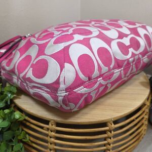 Color / Material: Pink fabric with creamy white Signature C pattern outlined in metallic silver; leather trim and accents
