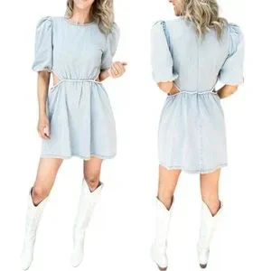 Chic and stylish, this light blue dress features elegant puff sleeves and a flattering cut-out design. Perfect for any occasion.
