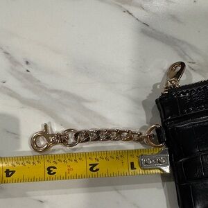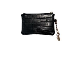 Elegant black wristlet with croc-embossed design. Features gold-tone logo plate. Ideal for chic outings.