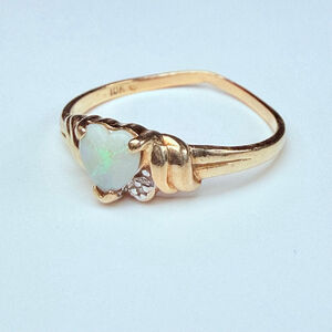 10K Solid Yellow Gold Plumb Milky White Real Opal & Diamond Heart Vintage Ring