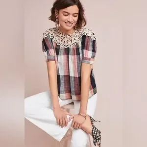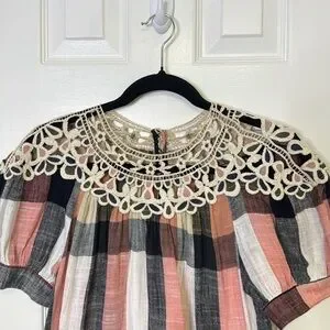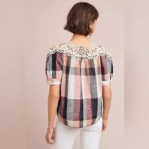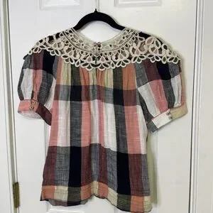 Anthropologie Pink and Black Puff Sleeve Blouse with Bib Collar