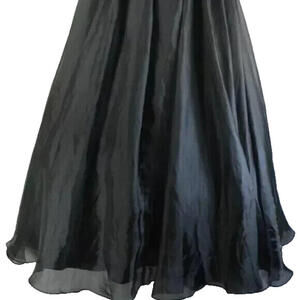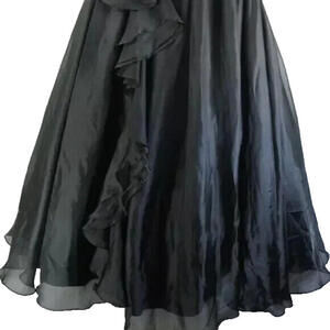 Elegant black gown with ruffled details. Sleeveless design. Perfect for formal events.