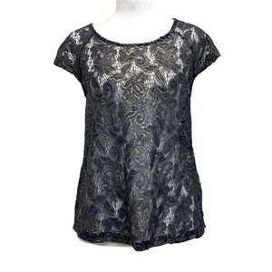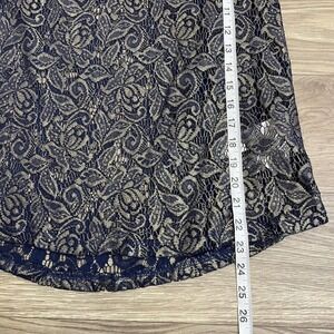 Excellent preowned condition Zara Trafaluc Lace Open Back Shirt in dark blue and metallic gold, size medium.