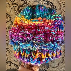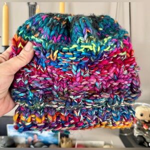 The colour mix is bold and intentional — jewel tones, neon accents, and earthy shades layered into a thick, cozy winter hat with a relaxed shape. The brim is not folded, giving it a slightly slouchy, sculptural look, and the crown is fully finished.