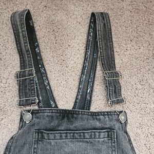 Free People Louise Denim Skirt Overall Rocky Mountain Black Sz 4 with adjustable Flower Straps distressed black denim