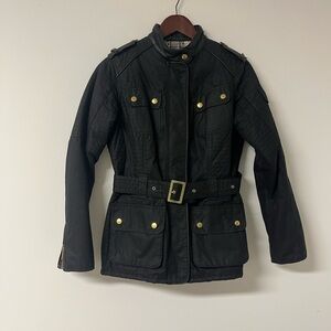Authentic Barbour Belted Waxed Jacket - Black - Leather Trim Sz US 8 UK 12