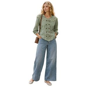 This elegant green top features a stylish double-breasted design with intricate lace detailing. Perfect for adding a touch of sophistication to any outfit.
