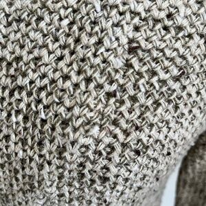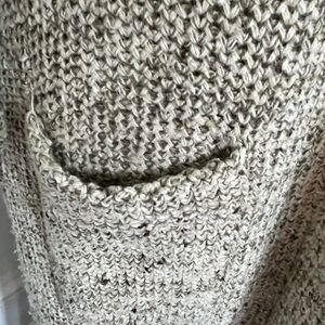 This cardigan has shoulder pads, two front pockets and a belt for closure.