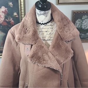 Chic blush colored shearling heavy coat. Features a stylish collar and zip details. Ideal for cozy outings.